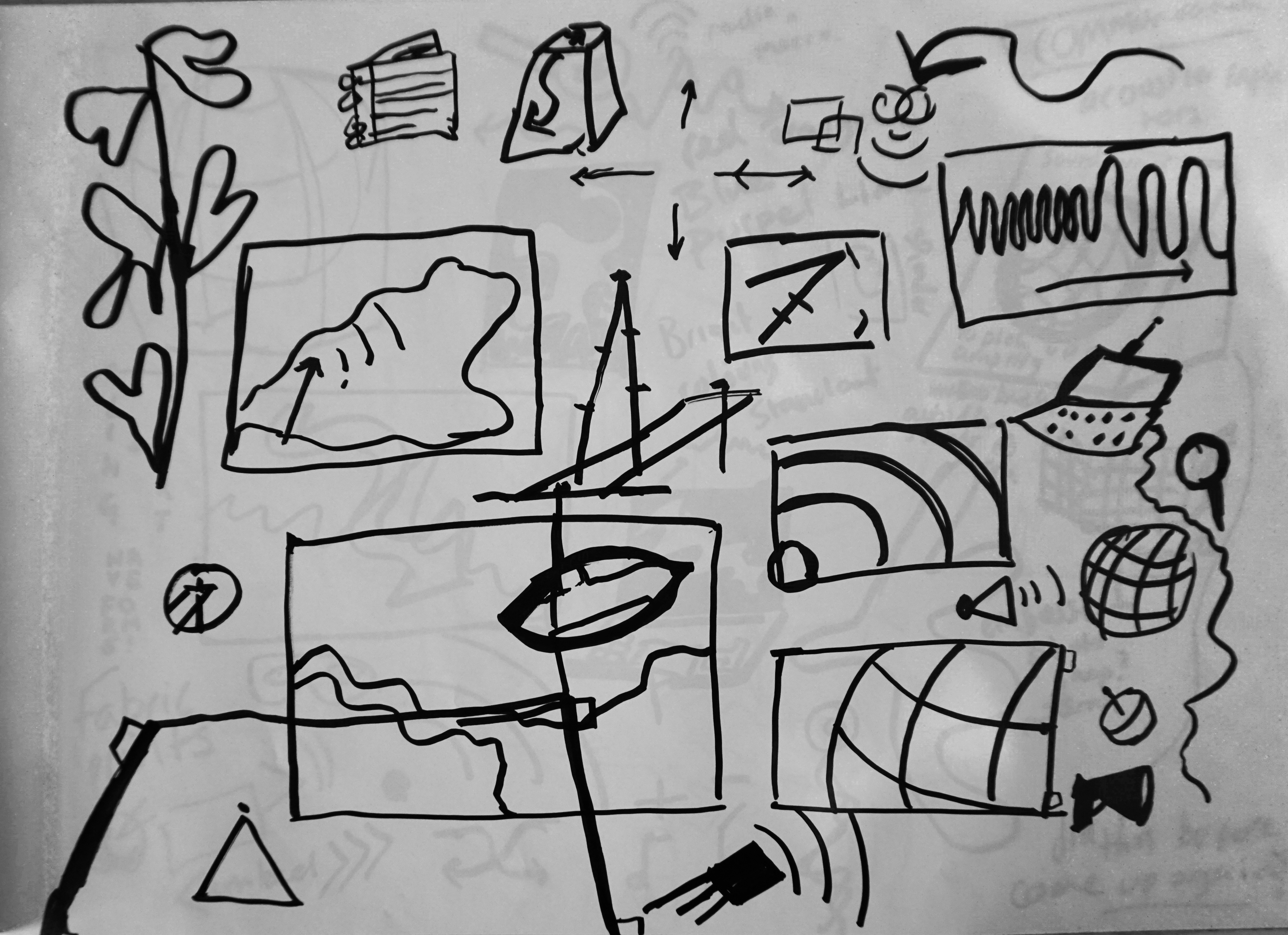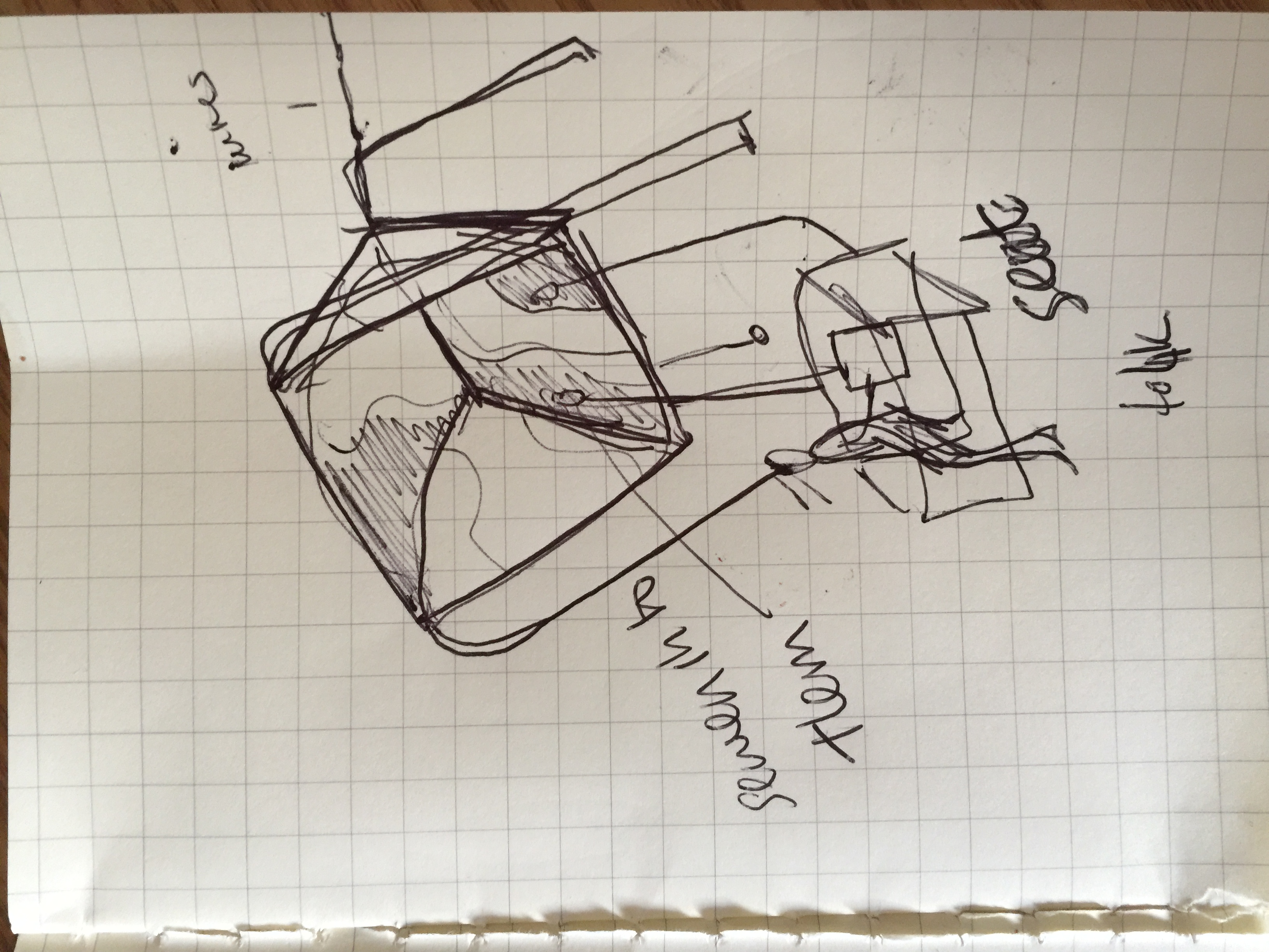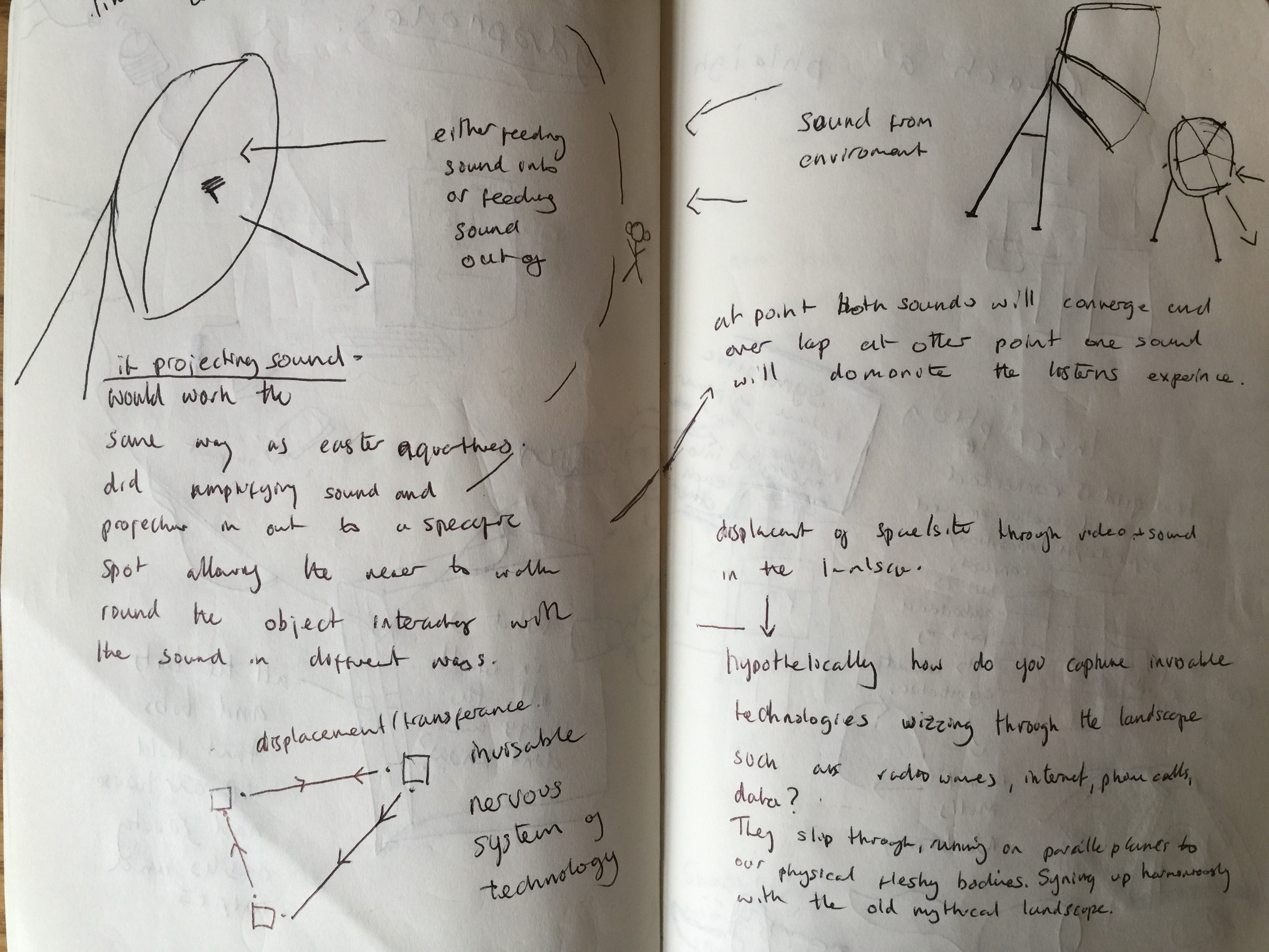 This made me rethink the structure of the devices for capturing and displacing sound (depicted below as large domes propped up on legs) and what I wanted their purpose to be. I changed the design of these “sound absorbing and displacement devices” and decided that they needed to be flexible and transportable, made out of readily accessible materials that were weather proof, durable and cheap. This choice was made so that I could fabricate these outwith a studio space and take them out at a moment’s notice to locations when the brief window of opportunity presented itself.