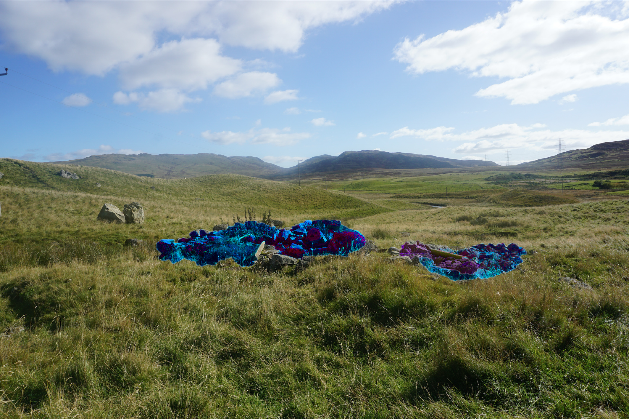 After futher investigation into how they would sit in the landscape, I felt the sheets shown above needed to have more of a structural element behind them. Taking the sheet out on tests, I felt it needed to be more textured and structured as the drawing and printing on sheets did not give the desired effect. From this I decided to test and use materials that were more reflective of the countryside, such as sleeping bags, military parachutes and hiking equipment, and sew into them, allowing the design process to unfold organically through making.